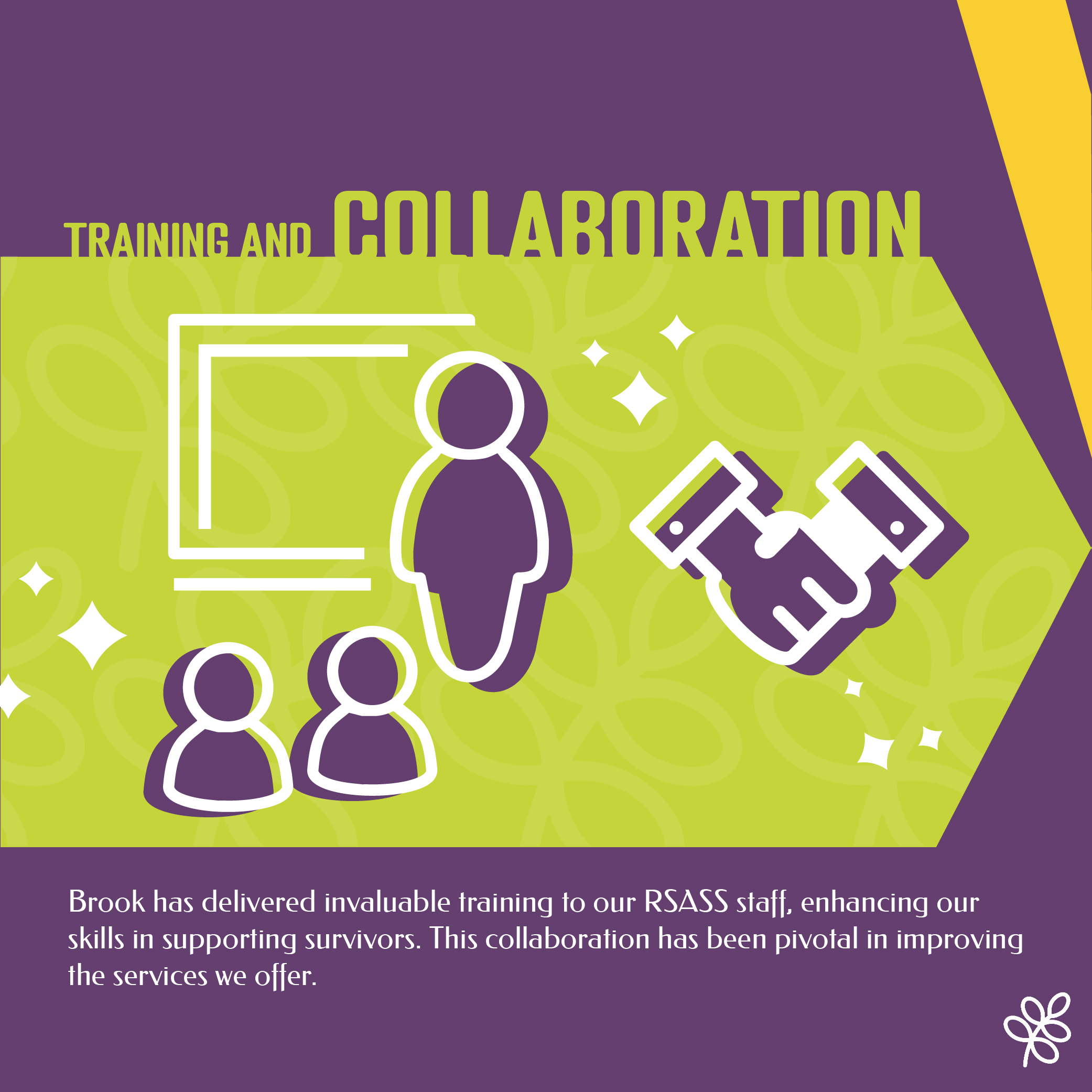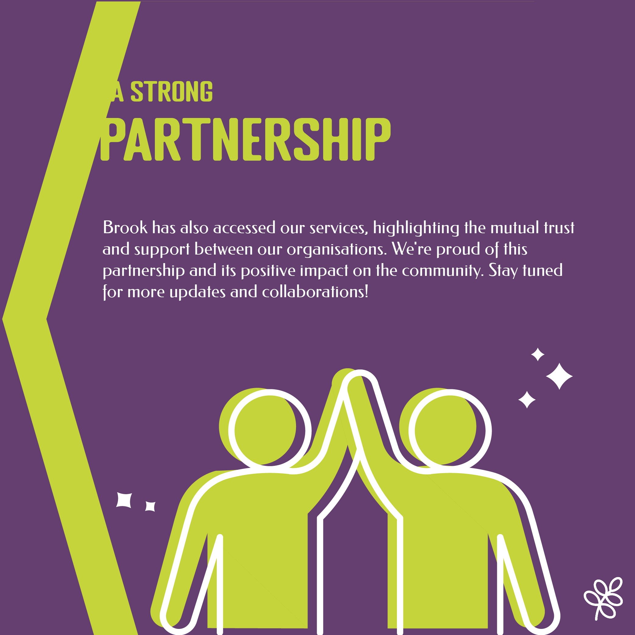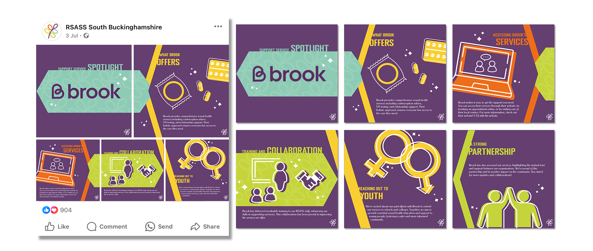 This is a series of social media posts created for a UK local charity organization, Rape and Sexual Abuse Support Service South Buckinghamshire, introducing one of its partner organizations. The concept primarily uses simple visuals to help users quickly and easily understand the main content, supplemented with a small amount of text for more in-depth explanation. The design aligns with the brand's color scheme to ensure a more unified overall look.